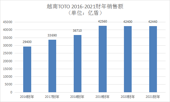 數(shù)據(jù)顯示,TOTO近年在越南的銷售額整體平穩(wěn)。2019財(cái)年突破40000億盾(約人民幣12.00億元)后,2020、2021財(cái)年均在42000億盾以上,其中2021財(cái)年還是越南疫情反彈較嚴(yán)重的一年,這一年TOTO在越南的營業(yè)利潤大幅減少65%。不過,正如TOTO建設(shè)第四工廠不僅為了越南市場,近年越南工廠的產(chǎn)品也大量出口海外市場。以2021財(cái)年為例,這一年TOTO在越南的銷售額為42440億盾(約人民幣12.73億元),其中外部顧客銷售額達(dá)到14390億盾(約人民幣4.32億元),占比超3成。
