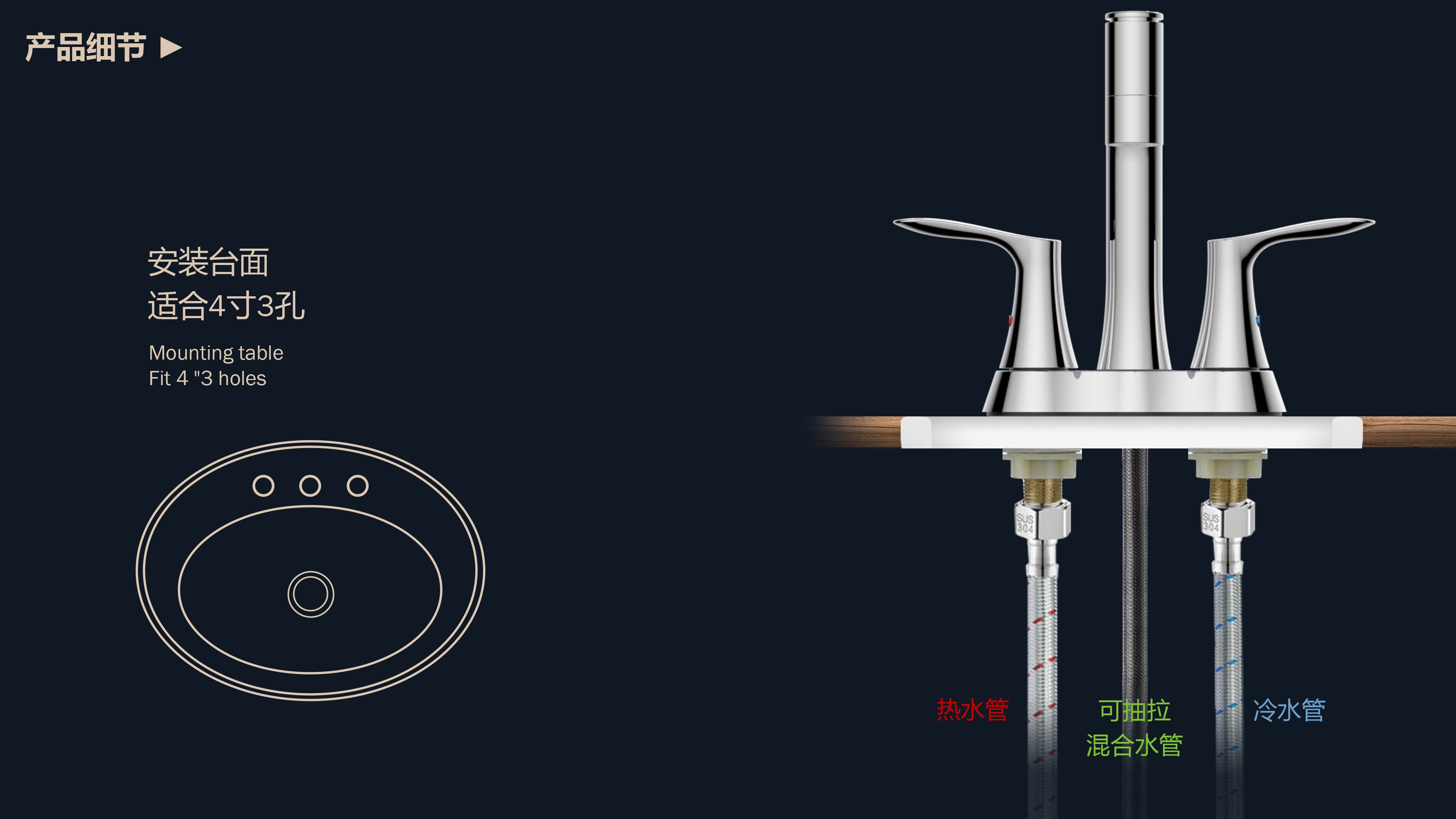 溫感三色LED燈光出水;日常洗頭利器,抽拉出水輕松洗;按壓切換兩功能水花;適合4寸3孔安裝臺面