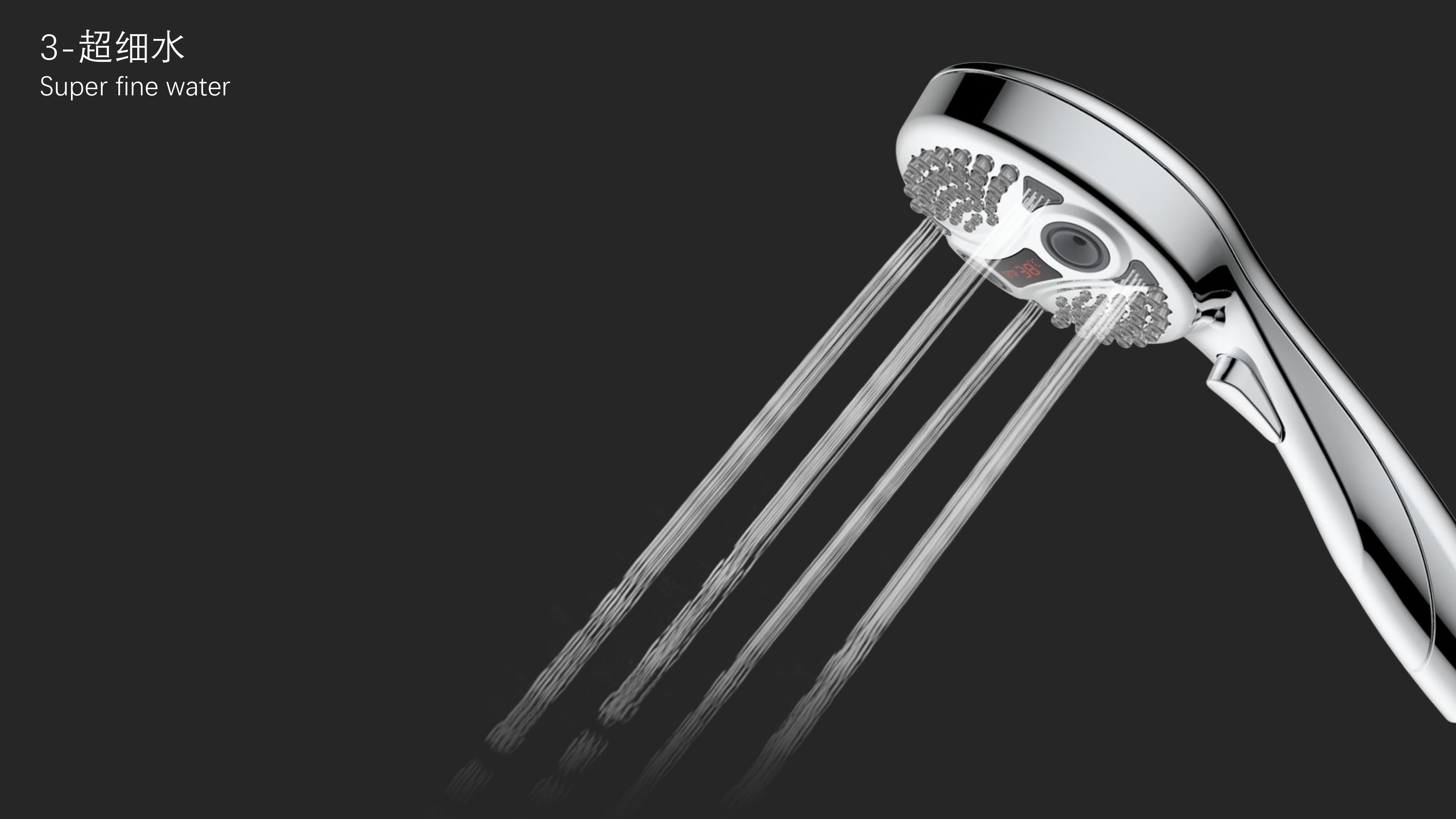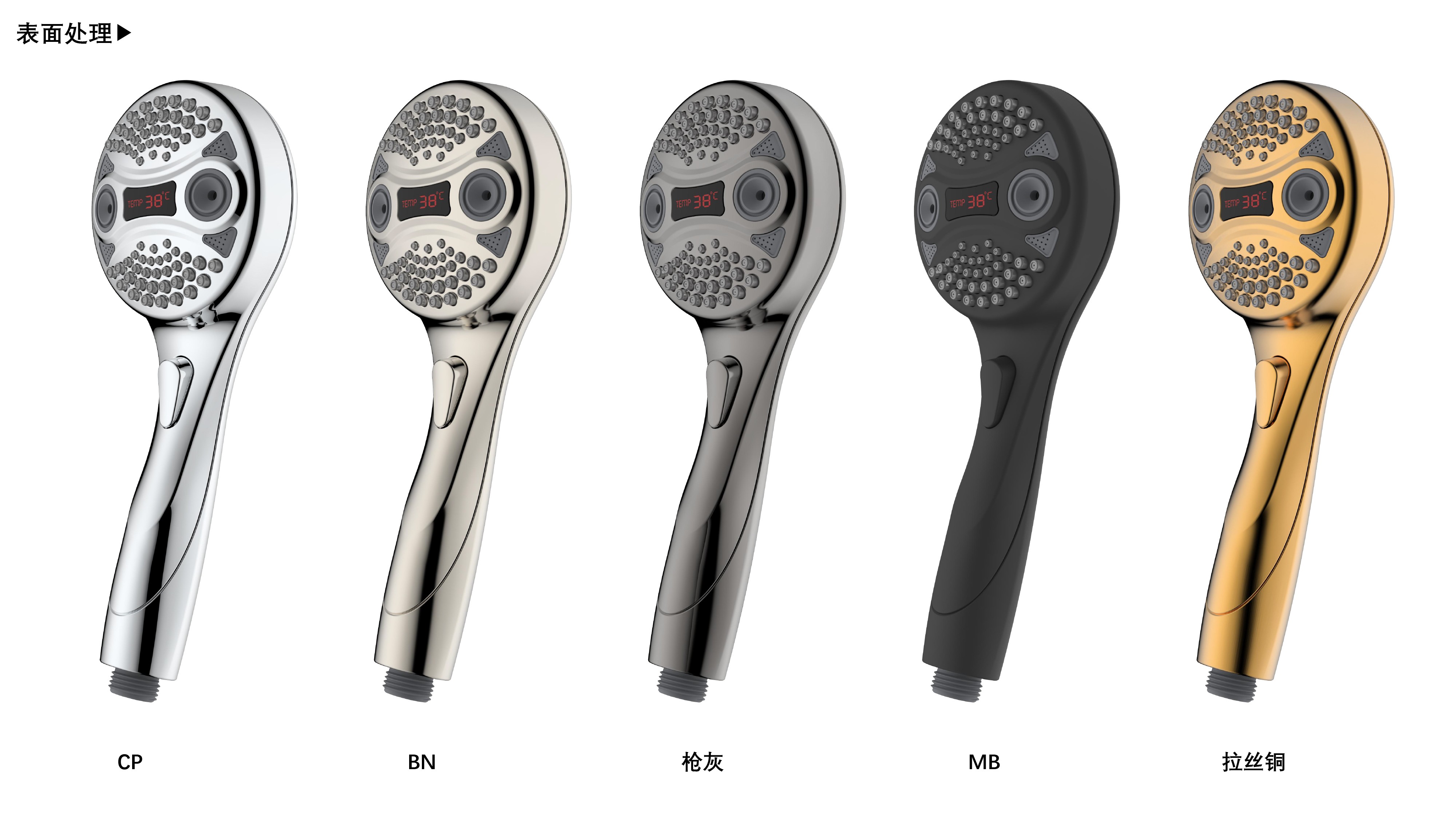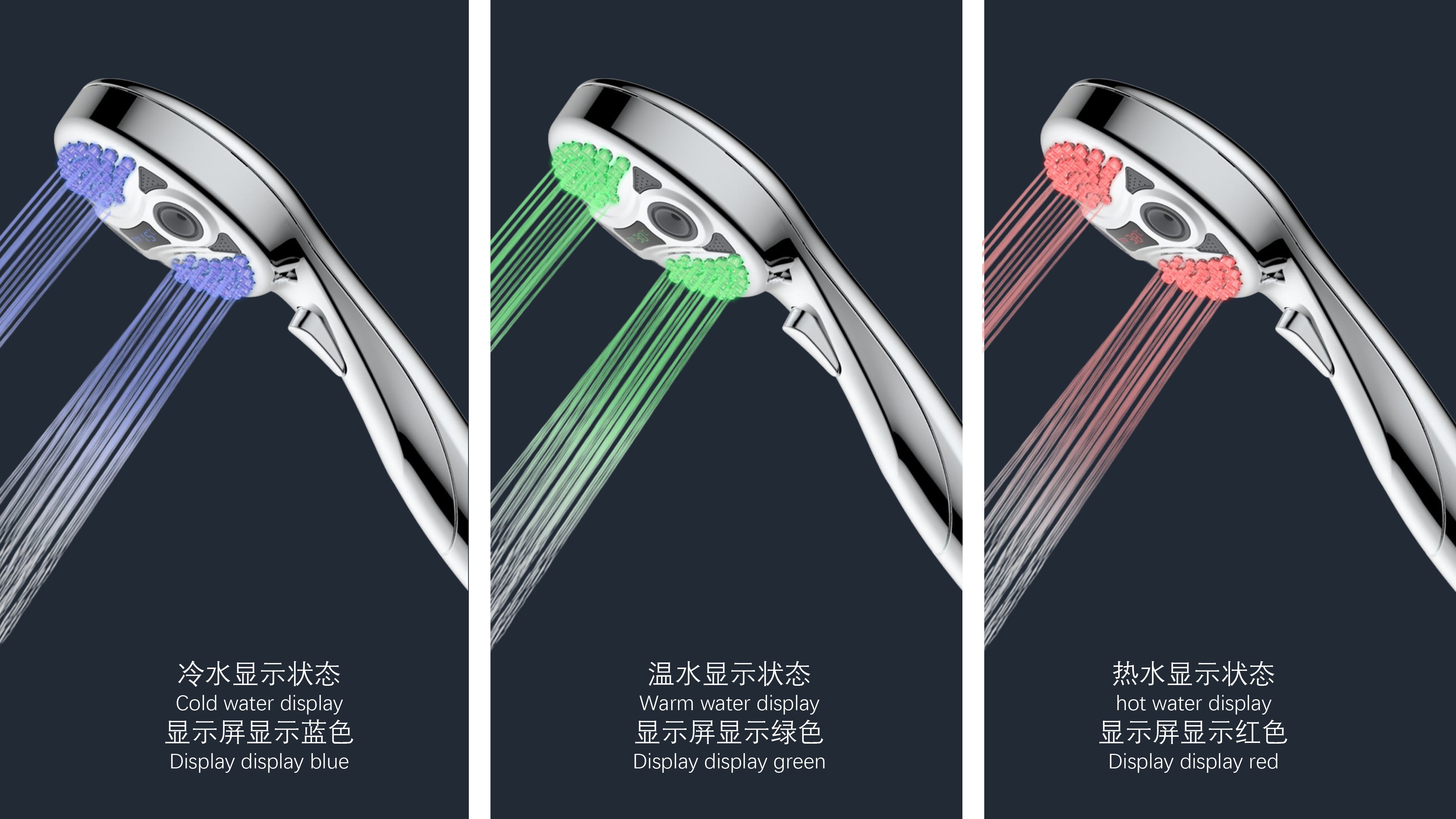 三功能溫顯花灑;獨特E.T.外觀設(shè)計;TPR出水孔,輕撥除垢;LED三色出水,看得見的水溫;按鍵切換三檔模式出水;握感舒適防滑