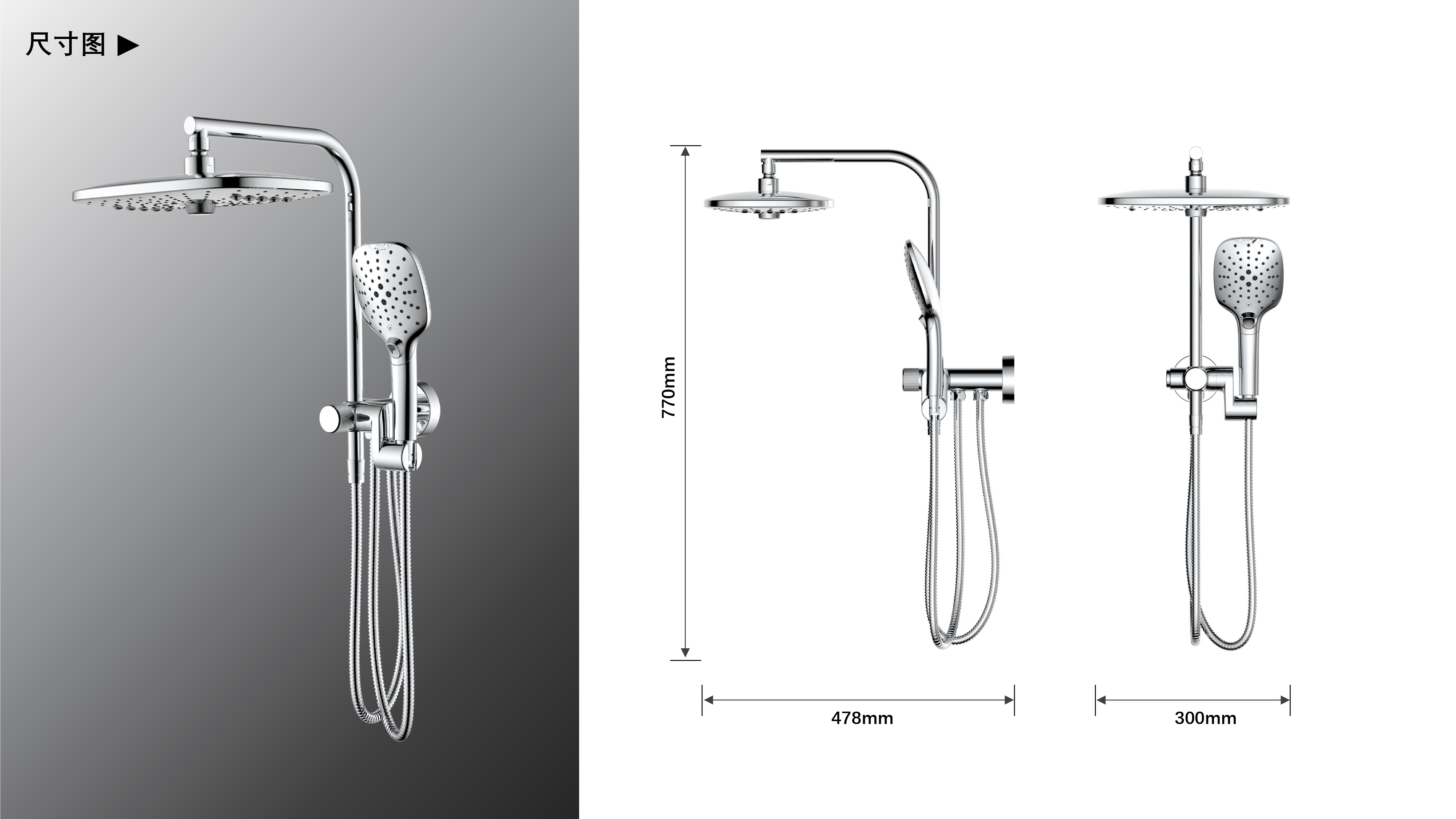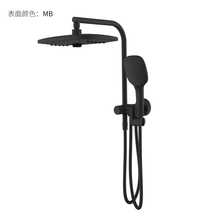 方形寬大頂噴富氧出水;Z字形三通;按壓切換花灑出水/頂噴出水